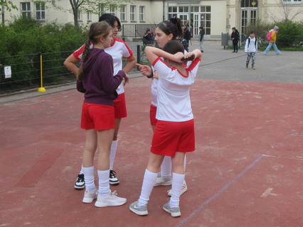 Team III setzte sich aus Elena N., Elisabeth (beide 3c), Helena (4a), Rukaya und Naya (beide 4b) zusammen. Für Elisabeth war es eine Premiere und für Elena lag das letzte Turnier schon ein Jahr zurück. Das Team erreichte nach zwei 1:0-Siegen in der Gruppenphase das Spiel um Platz 3, das allerdings 0:2 verloren ging. Die Tore bei den beiden Siegen erzielten Naya und Helena. Für Helena war es der erste Treffer für unsere Schule. |
