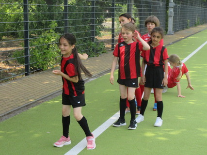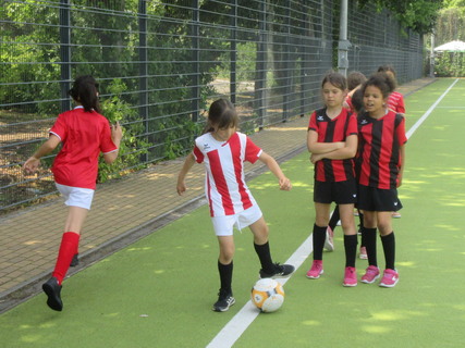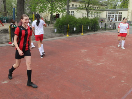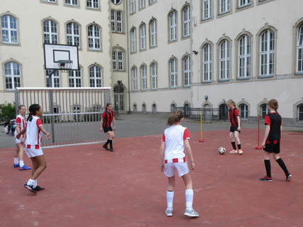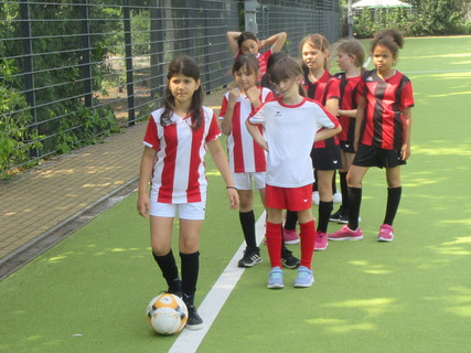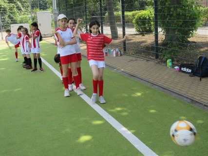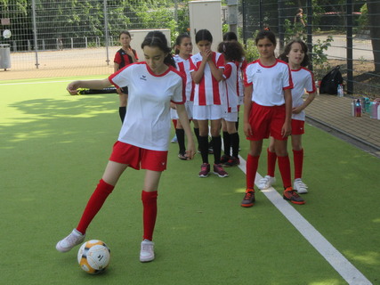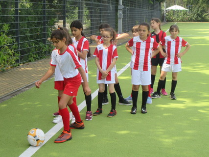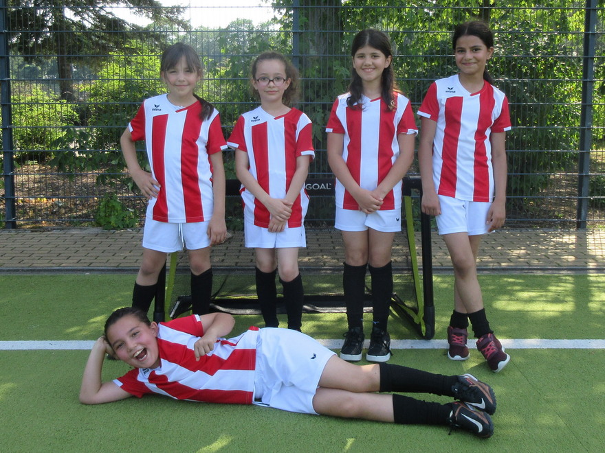 Bunt gemischt war Team IV, angeführt von der erfahrenen Viertklässlerin Jana (4b) und ihrer Klassenkameradin Alsu. Mehrmals schon war Alsu bei Turnieren von Herrn Kohler in den Kader berufen worden, doch immer war etwas dazwischen gekommen. Nun sollte sie endlich ihr Debüt feiern! Außerdem in Team IV waren unsere drei leistungsstärksten Zweitklässlerinnen Agniia (1/2b), Enna (1/2e) und Lilah (1/2f), die sich durch herausragende Vorstellungen beim Soccer-Turnier ihrer Altersstufe für diesen Einsatz empfohlen hatten. Alle drei konnten ihre Nominierung eindrucksvoll rechtfertigen. Lilah traf schon im ersten Spiel doppelt und beim 3:2-Sieg im Spiel um Platz 5 konnten alle drei Zweitklässlerinnen ein Tor erzielen. Auch Alsu schoss gleich bei ihrem ersten Spiel ein Tor und Jana war ebenfalls erfolgreich. Hinzu kam wieder mal ein Eigentor. |