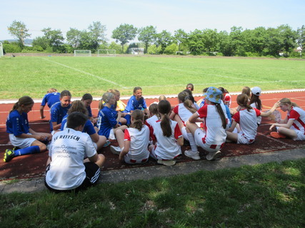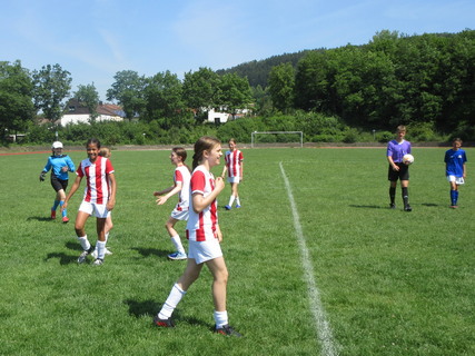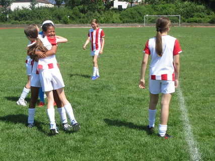Kurz darauf pfiff der Schiedsrichter ab, der die Partie sehr gut und umsichtig geleitet hatte, und unsere Fußball-Mädchen fielen sich jubelnd in die Arme! Durch eine wieder einmal beeindruckende Mannschaftsleistung hatten sie einen starken Gegner auf dessen eigenem Platz besiegen können und fügten damit der an Erfolgen schon so reichen Saison einen weiteren Triumph hinzu. Schön war aber auch, wie gut sich die Mädchen beider Schulen auf und anschließend auch neben dem Platz verstanden: Da wurden Handynummern ausgetauscht, aus den jeweiligen Leben berichtet und zum Schluss auch noch einmal mit nun gemischten Mannschaften Fußball gespielt! Die Ludwig-Cauer-Grundschule bedankt sich auf diesem Wege nochmals bei Frau Steidl, ihren Fußball-Mädchen und der gesamten Siegmund-Loewe-Realschule für die tolle Zeit, die wir dort verbringen durften, und es wurde bereits verabredet, dass wir uns wieder melden, wenn wir das nächste Mal in Kronach sind! |