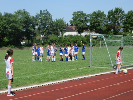 Obwohl nun scheinbar etwas schwächer aufgestellt, ging unsere Mannschaft nach einem sehr schönen Spielzug in Führung: Malak traf nach Vorlage der eingewechselten Julia! Leider konnte unser Team diese Führung aber nicht lange halten, denn der Gegner hatte eine sehr dribbelstarke Spielerin in seinen Reihen, die nach einem Alleingang über das halbe Spielfeld vor Ajlin auftauchte und sicher zum Ausgleich traf. |